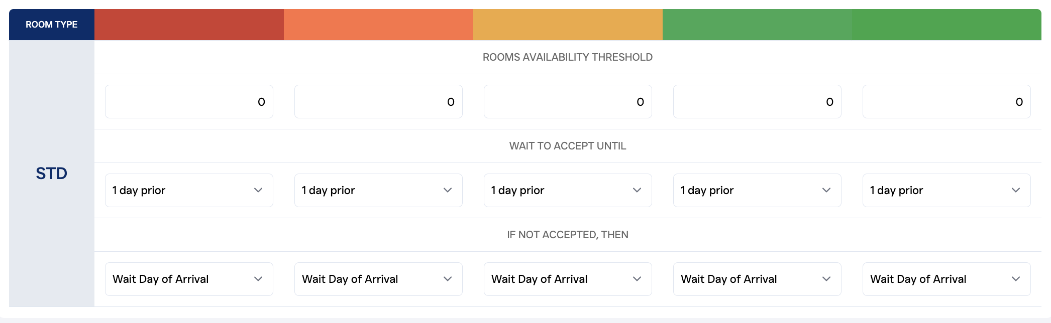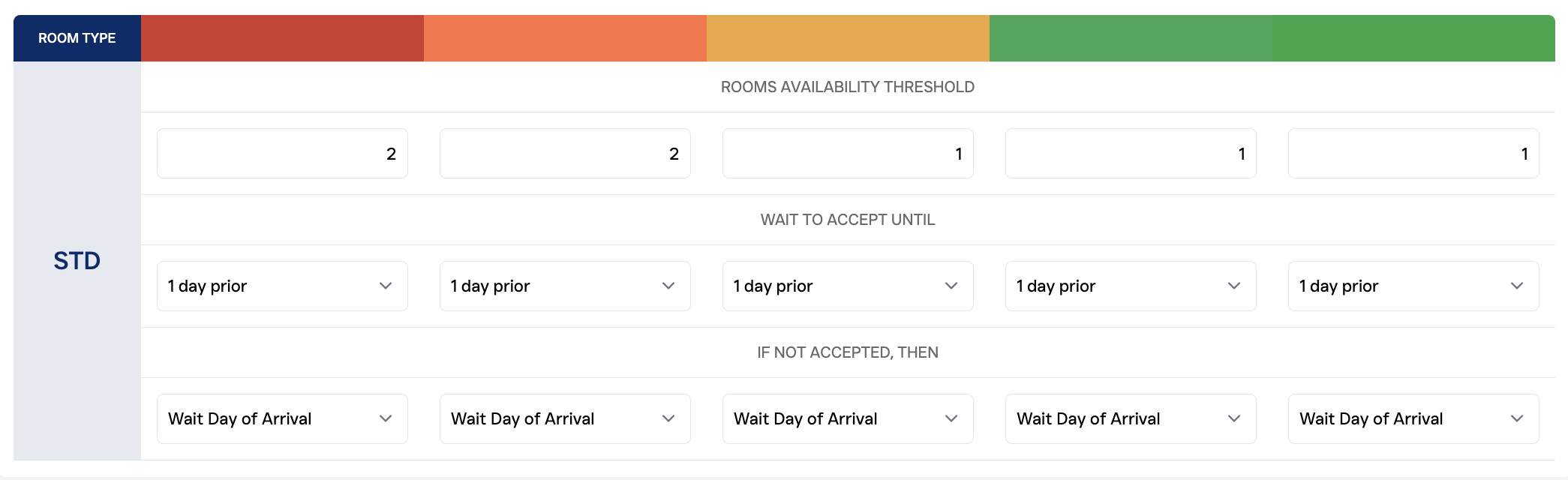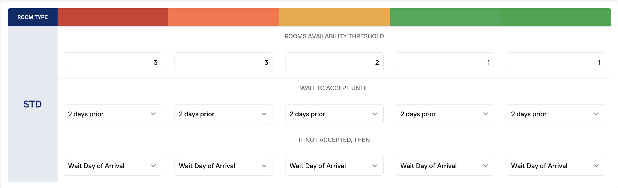This default setting will automatically accept all upgrade bids received if the room type is not sold out. With this setting you make sure that you don’t miss any offer received by your guests and will automatically accept them one day prior to the guests arrival.