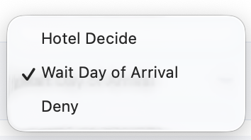 If the bid was not accepted at the first stage, you should decide what happens with the bid at the second stage. The options are “wait till day of arrival” (recommended - in case there are any changes in availability), “instantly deny” or “Hotel Decide” (hotel user has to manually accept/deny the bid).