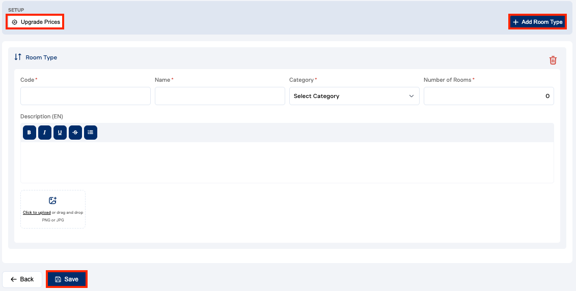 When all room types have been added, click Save to upload them in bulk and proceed with the upgrade pricing.