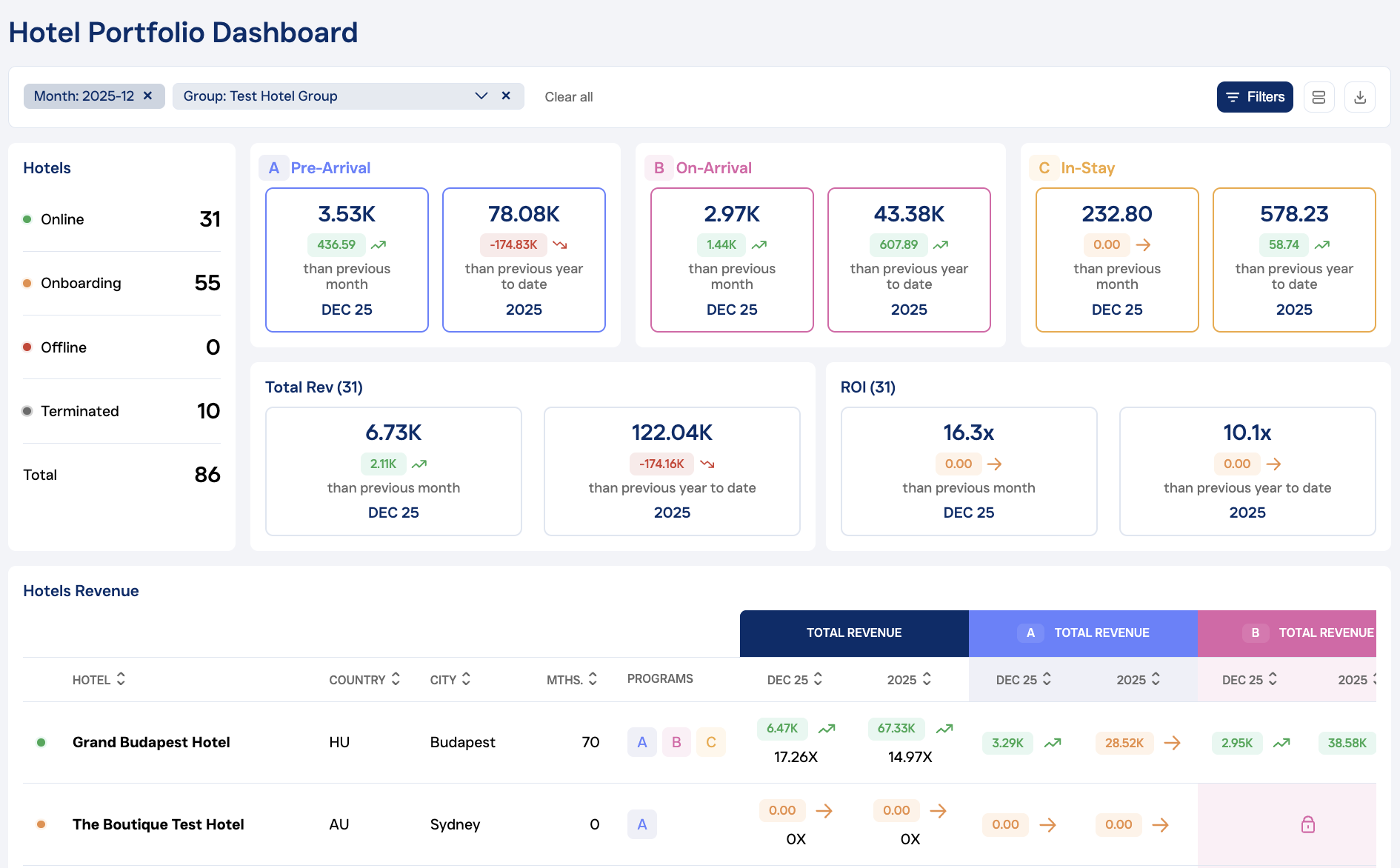 Track hotel status, revenue trends, and performance across all upselling programs