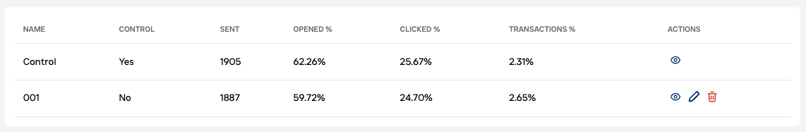 This table provides a clear comparison between the control email and the test variant, allowing hotels to evaluate performance based on key engagement and conversion metrics such as open rate, click-through rate, and transaction rate.