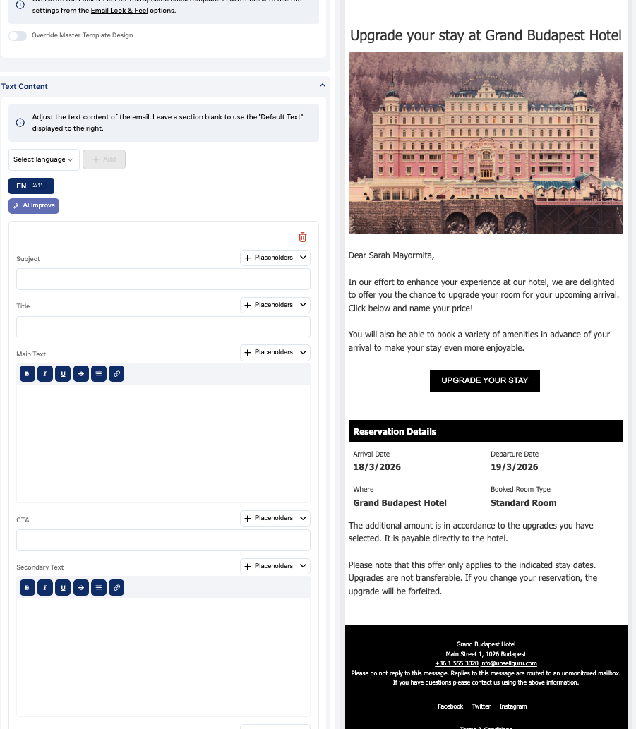 2. UpsellGuru provides a default text for each email which can be seen in the preview (right side). If you would like to override the default text, simply enable the override button and enter your custom text on the left side.