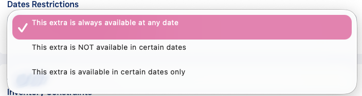 Date Restrictions: Make Extra always available or just on certain date periods.