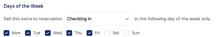 Days of the week: Offer extras only if guest is either (1) checking-in, (2) Checking-out or (3) Staying on selected days of the week.