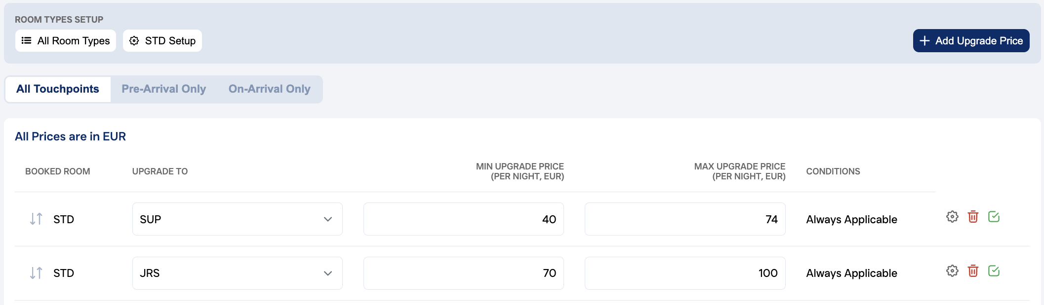 Depending on your package, you can offer different room upgrade prices to specific touchpoints. Selling Touchpoints: All, Pre-Arrival, On-Arrival.