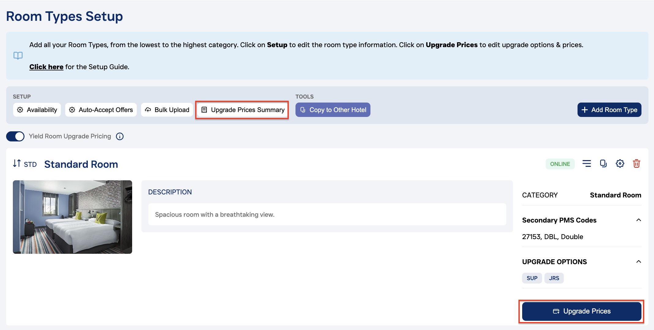 There are 2 ways to upload up-selling prices: In a grid for all rooms (Upgrade Prices Summary) or per room (Manage Upgrade Prices).