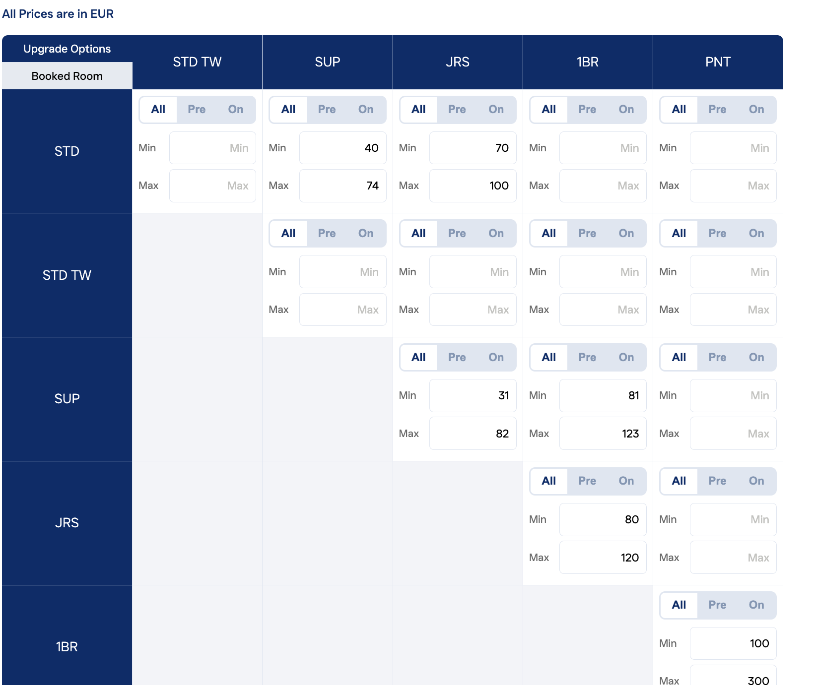 Insert the minimum and maximum prices for upgrades from the "Room Type Booked" (vertical) to the selected "Upgrade Options" (horizontal). Leave it at zero if you don't want to offer upgrades between the room types.