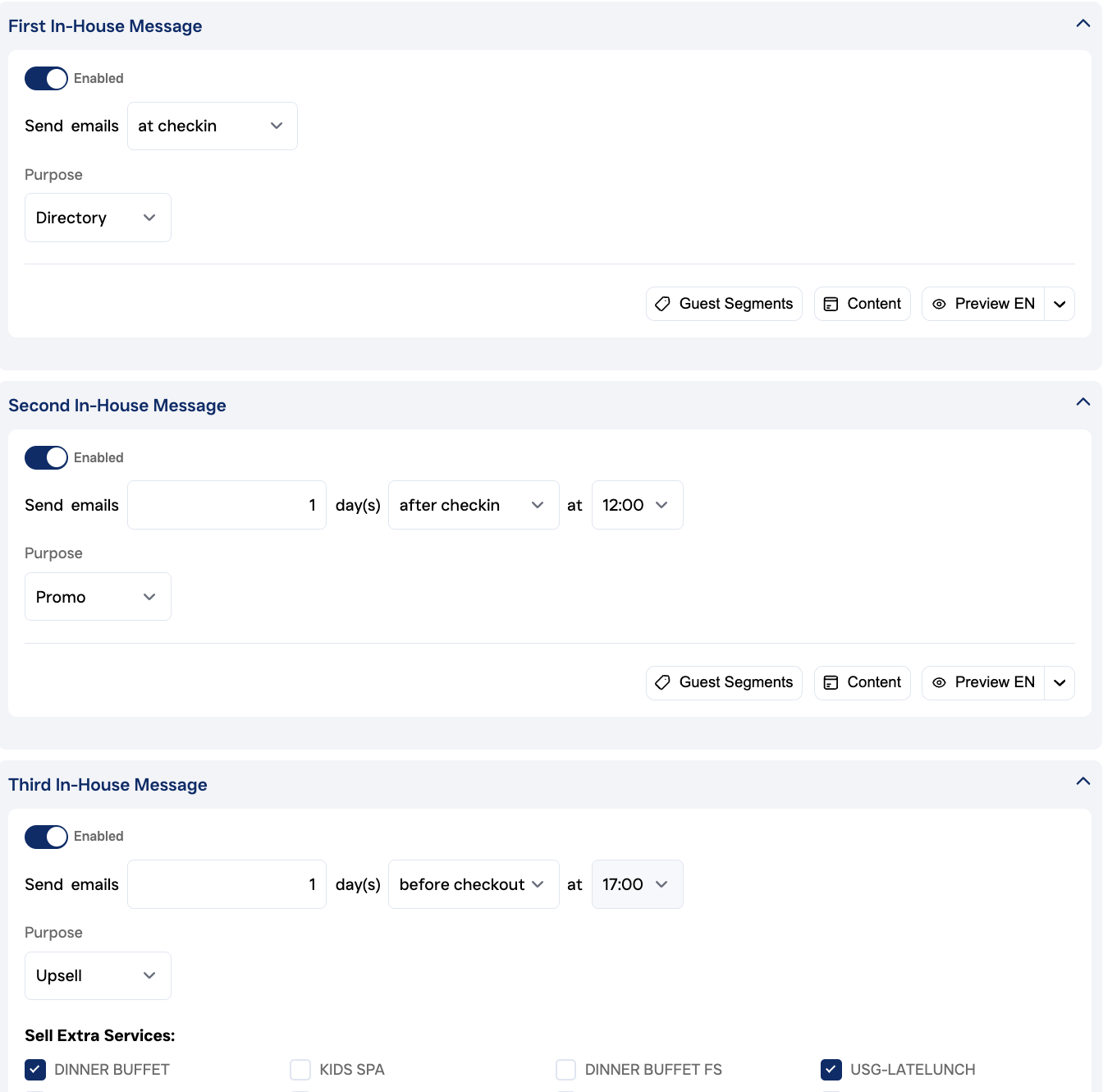 You can send these messages via email or SMS at the time of check-in, at a specific day and time during the stay or at check-out day.