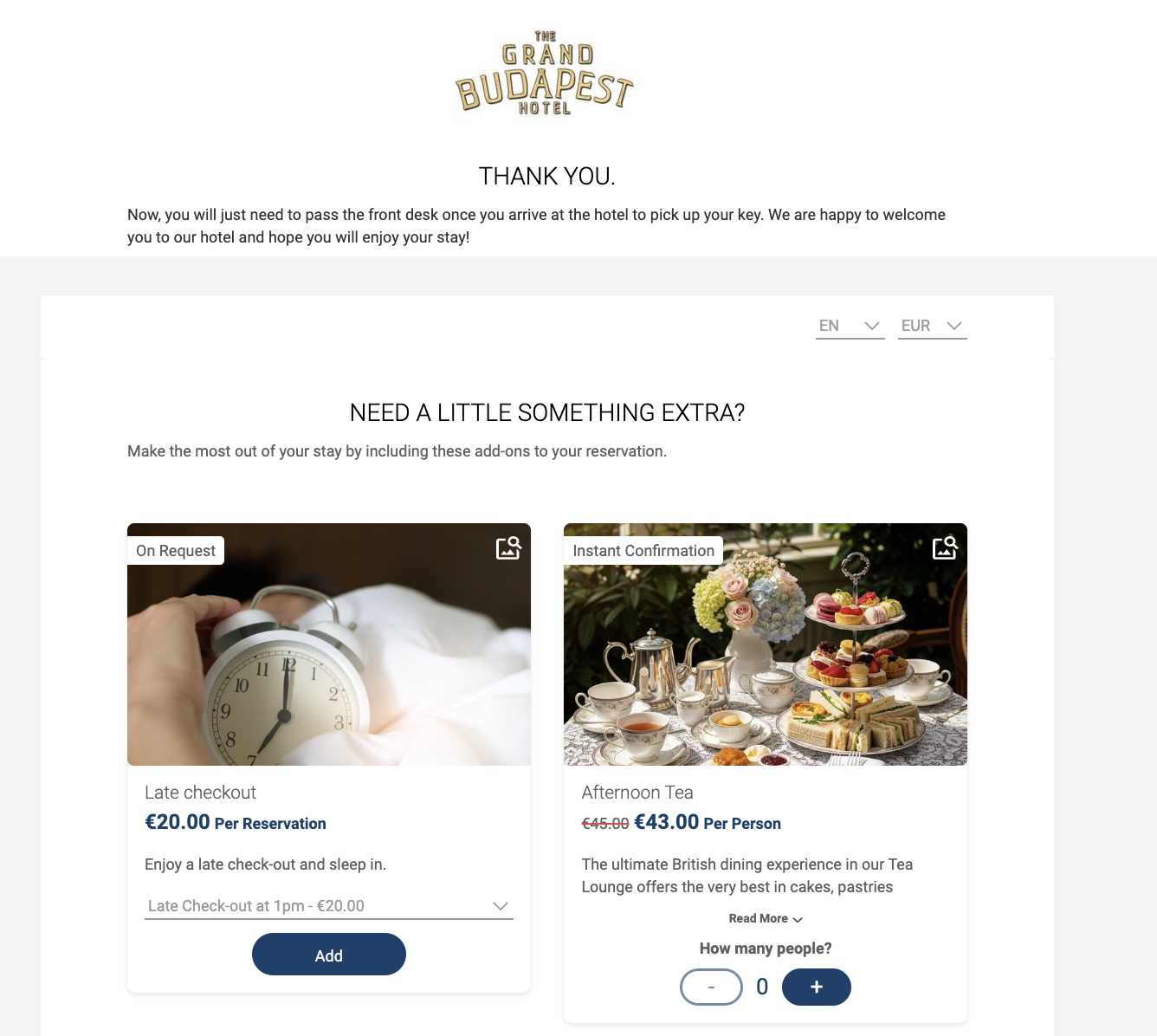 After the guest submitted the registration card (provided the guest booked via email and we can identify the reservation), they will be shown a page displaying all available extras for that touchpoint. This includes: